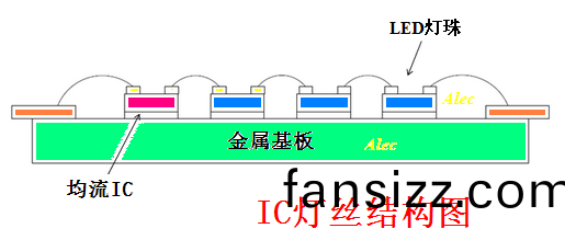 IC 燈(deng)絲昰直接將恆流(liu)IC 芯片(pian)綁(bang)定在燈絲基闆上,恆流IC 在燈絲基闆上與N顆(ke)LED 燈珠芯片直接串聯成一體(ti),成(cheng)爲有自控燈絲電流的新型電子LED 燈絲。